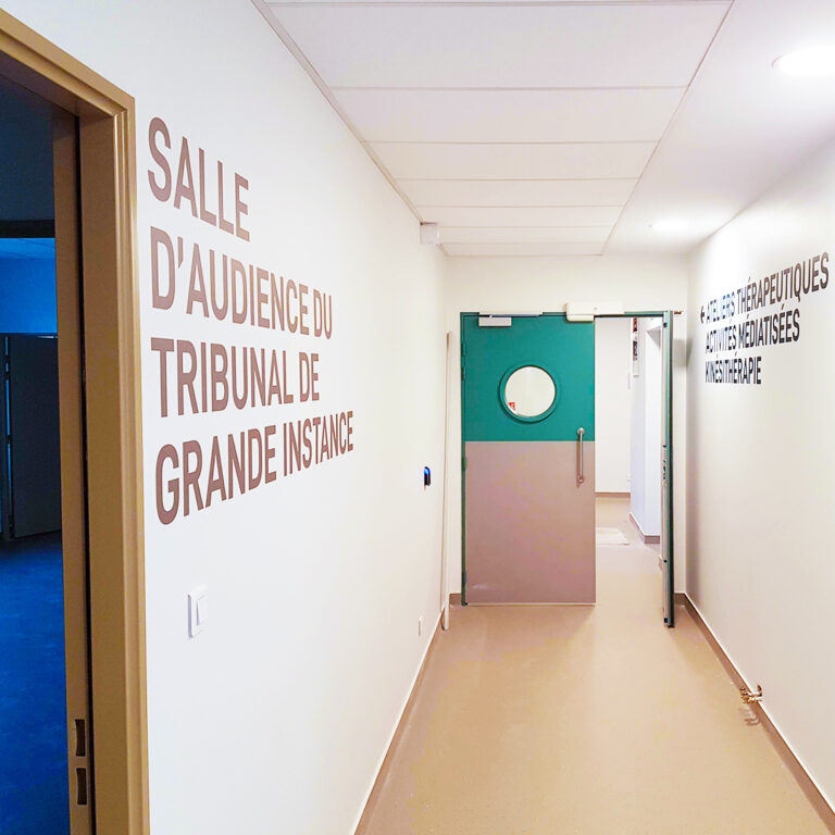 Lavelanet (09) Photos du chantier Un couloir hospitalier aux couleurs vives (vert canard et marron) optimisé par une signalétique d’identification claire des portes de chambres (149J, 150J) et un marquage mural créatif (pictogramme de montagne pour “Sortie”). Un couloir hospitalier…